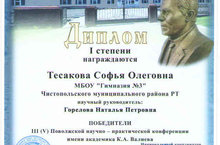 Поздравляем Тесакову Софью, ученицу 4А класса, с победой в III Поволжской научно-практической конференции имени академика К.А.Валиева. Желаем дальнейших творческиих находок, достижений и побед!