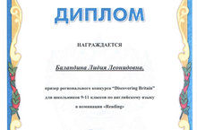 Поздравляем призера регионального конкурса «Discovering Britain» для школьников 9-11 классов по английскому языку в номинации «Reading» Баландину Л., ученицу 11 класса. (учитель Храмова Н.И.). Молодец!