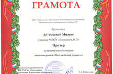 Поздравляем призера муниципального конкурса стихотворений «Мой любимый учитель» Артемьеву М., ученицу 2 класса. Умничка! (учитель Корчагина Е.Ю.)