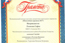 Первое место в муниципальном конкурсе – выставке декоративно-прикладного творчества «Новогодняя игрушка -2017» заняли Тесакова С., Хизбуллин С., ученики 3 класса, Корнев Д., ученик 1 класса, Мазалова А., ученица 9 класса. Второе место заняли Медведев А., ученик 3 класса, Мокеева В., Осипова П., ученицы 1 класса. Третье место заняли Андрианова К., ученица 3 класса. Грамотами за активное участие награждены Субботина А., Говоркова В., Бакеева Э., Ибатова Э. (Учителя: Горелова Н.П., Куракина Е.Л., Саттарова Л.Х.) Молодцы!