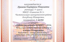 Казанский национальный исследовательский технологический университет награждает дипломом ученицу нашей гимназии Храмову Е., занявшую 1 место в конкурсе «Нобелевские надежды КНИТУ -2016» в номинации «Отечественная история и история Татарстана» (учитель Хайруллина С.В.). Поздравляем!