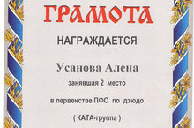 24 февраля 2016 года в г. Уфа прошло первенство Приволжского федерального округа по дзюдо среди юношей и девушек до 15 лет. Поздравляем Усанову Алену, занявшую 2 в первенстве ПФО по дзюдо (КАТА-группа) среди юношей и девушек до 15 лет. Молодец! Так держать!