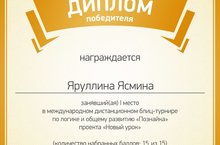 Поздравляем обучающихся 3-х классов - Сиротина Павла 3Б кл. , Спирину Валерию 3Б кл., Яруллину Ясмину 3В кл., Прыткова Даниила 3Гкл., Тимяшкину Арину 3В кл. (руководитель: педагог-психолог – Шумилова Т.М.) с победой в международном блиц-турнире "Познайка" проекта Инфоурок по логике и общему развитию . Молодцы! Желаем дальнейших побед!