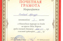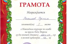 Поздравляем Рахимова Рустама, занявшего I место в Новогоднем турнире по самбо на призы Деда Мороза среди юношей 2003-2004 г.р. в весовой категории 42 кг. Молодец!!!