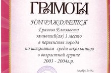 Поздравляем Грачеву Елизавету, ученицу 5 класса, занявшую I место в первенстве города по шахматам среди школьников в возрастной группе 2003-2004г.р. Молодец!