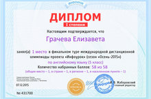 Поздравляем Грачеву Е., ученицу 5 класса (учитель Арнюскина Н.В.), занявшую I место в финальном туре международной дистанционной олимпиады проекта Инфоурок (сезон "Осень -2015") по английскому языку. Молодец! Желаем дальнейших побед!