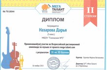 Поздравляем Назарову Д., ученицу 5 класса, призера Всероссийской дистанционной олимпиады по музыке от проекта МЕГАТАЛАНТ (учитель Харчева М.В.). Умница! Так держать!
