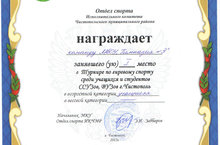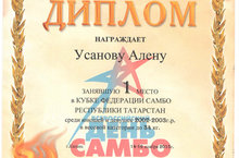 Поздравляем Усанову А. , занявшую 1 место в Кубке Федерации самбо Республики Татарстан среди юношей и девушек 2002-2003 г.р. в весовой категории до 34 кг. Грамота подписана министром спорта Российской федерации Мутко В.Л.