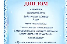Дипломом 1 степени награждена ученица 3 класса, Заболонская Марина, руководитель А.А. Аделева . Она связала куклу своими руками «Кукла Норвегии Дагни» для муниципального конкурса «Кукла своими руками». На это ее вдохновило литературное произведение К. Паустовского «Корзина с еловыми шишками».