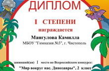 Ученики 2В класса приняли активное участие во Всероссийском конкурсе «Мир вокруг нас. Динозавры». Из 20 детей, принявших участие, 11 получили дипломы победителей. Диплом за 1 место получила Мангулова К.