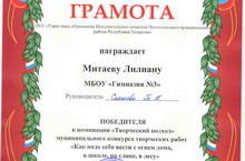 Ребята начальных классов отправили на конкурс свои рисунки на тему «Как надо себя вести с огнем дома, в школе, на улице, в лесу». Митаева Л., ученица 2Б кл. (учитель Семенова Т.Н.) стала победителем в номинации «Творческий подход».