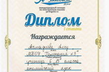 Поздравляем победителей Международного конкурса: Константинову Я., 5 «А» кл., (Диплом I ст., учитель Арнюскина Н.В.), уч. 6 «В» кл. Опекунову Д. (Диплом II ст.), Ахмадиеву А., Чекурову Л., Самсонову В. (Дипломы I ст., учитель Храмова Н.И.).