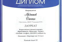Поздравляем ученика 1А класса Арзютова Д., лауреата Всероссийского заочного конкурса «Креативность. Интеллект. Талант» в номинации «Учусь на отлично!»...