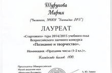 Поздравляем Шурупову М., ученицу 1А класса, лауреата "Стартового" тура Всероссийского заочного конкурса "Познание и творчество" в номинации "Праздник числа" (1-2 кл.).