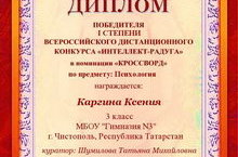 Поздравляем Каргину К., ученицу 3В кл. нашей гимназии с дипломом победителя I степени Всероссийского дистанционного конкурса «ИНТЕЛЛЕКТ-РАДУГА» (куратор: педагог-психолог – Шумилова Т.М.).