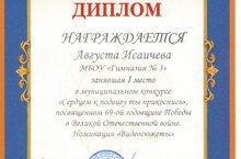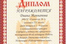 Ученица 9Г кл. нашей гимназии Маннапова Д. заняла III место среди учащихся 1-9 классов в муниципальном конкурсе "Сердцем к подвигу ты прикоснись", посвященном 69-ой годовщине Победы в Великой Отечественной войне в номинации "Художественное слово".