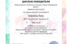 В номинации «Сочинение» I место заняла Емелина Л., ученица 4А кл. (учитель Зиганшина Л.С.).