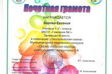 В номинации «Экологическая сказка» II место заняла Барова Е., ученица 9Г кл. (руководитель: Хайруллина С.В.). Кузьмина А., ученица 7В кл., Фахрутдинова Л., ученица 10Б кл. также принимали активное участие в этом творческом конкурсе.