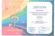 Бацина А., ученица 8б кл. заняла 3 место в республиканском конкурсе творческих работ «Музыкальная палитра» (куратор: Харчева М.В.).