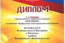 Исаичева А., ученица 7 В кл. награждена дипломом 1 степени за работу «Видеорепортаж «Женское ремесло», Валдавина А., ученица 8А кл. награждена дипломом 2 степени за работу «Ремесленная изюминка семьи».(руководитель: Хайруллина С.В.).