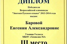Ученица 9Г кл. Барова Евгения участвовала в заочной олимпиаде по русскому языку и заняла 3 место (учитель Хайруллина С.В.).
