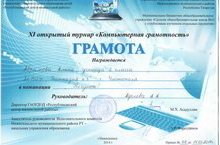 14 марта 2014 г. в Нижнекамске прошел турнир «Компьютерная грамотность». Ученица нашей гимназии Абрамова А., ученица 2 Г кл. (учитель Аделева А.А.) дошла до финала турнира, награждена грамотой в номинации «Рисунок».