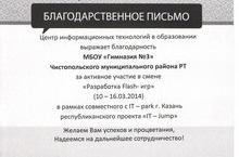 С 10 по 16 марта 2014 года ученик 11Б кл. Холин И. активно участвовал в смене «Разработка Flash-игр» в рамках совместного с IT-park г.Казань республиканского проекта «IT-Jump».