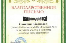 Синявин Владислав, ученик 8б кл., занял 3 место в муниципальном конкурсе «Здорово быть здоровым!» в номинации «Статья».