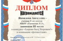 Яковлева Ангелина, ученица 8в кл., заняла 3 место в муниципальном конкурсе «Здорово быть здоровым!» в номинации «Фотоколлаж».