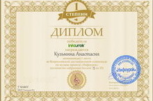 19 декабря на сайте инфоурок проходила дистанционная олимпиада по музыке. Ребята 6,7,8 классов стали победителями и призёрами конкурса: 1 места - Кузьмина Анастасия (7в кл.), Петрова Вероника (7г кл.); 2 место - Галиев Артур (8а кл.), Платонова Дарья (6г кл.).