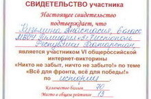 Учащиеся Чехонина Екатерина, Галимуллина Альбина, Кузьмина Анастасия принимали участие в VI общероссийской интернет-викторине «Никто не забыт, ничто не забыто!» по теме «Всё для фронта, всё для победы!» (учителя Хайруллина С.В., Красильникова С.В.).