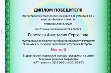 Горелова Анастасия, ученица 4В кл. заняла 2 место во Всероссийском творческом конкурсе «Зеленая планета» (учитель Хуснутдинова Л.Ш.).