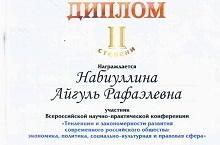 17 мая прошла Всероссийская научно-практическая конференция. Учащиеся нашей гимназии Темников Динар занял 1 место (учитель Чикрина В.А.), Набиуллина Айгуль заняла 2 место ( учитель Давлетшина Р.И.), Чехонина Екатерина заняла 2 место (учитель Хайруллина С.В.).