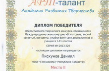 Пискунов Даниил, ученик 2а класса участвовал в творческом конкурсе, посвященный Международному женскому дню и занял 2 место (руководитель: Борисова М.А.).