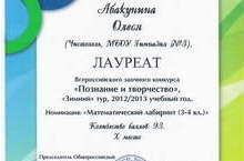 Абакунина Олеся, ученица 3А кл. заняла 10 место во Всероссийском заочном конкурсе «Познание и творчество» в номинации «Математический лабиринт» (руководитель: Горелова Н.П.).