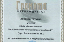 Зверева Татьяна, ученица 11 класса принимала участие в Республиканском конкурсе детских публикаций, посвященных интернациональной дружбе народов РТ Фестиваля детского творчества «Вместе мы – одна страна!».