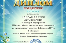 Поздравляем Латыпова Риназа, ученика 4В класса за победу в мероприятии «II Всероссийская дистанционная олимпиада по окружающему миру для 1-4 классов» II тур.
