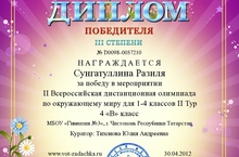 Поздравляем Сунгатуллину Разилю, ученицу 4В класса за победу в мероприятии «II Всероссийская дистанционная олимпиада по окружающему миру для 1-4 классов» II тур.