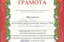 Левин Олег Михайлович, преподаватель – организатор предмета ОБЖ нашей гимназии занял первое место в зональном этапе республиканского конкурса «Учитель года Республики Татарстан по курсу «Основы безопасности жизнедеятельности» 2011-2012 учебного года». Поздравляем! Желаем победы на республиканском этапе!