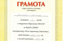 В детской спортивной школе «Батыр» г. Чистополя прошло открытое первенство по борьбе самбо, посвященное Дню защитника Отечества, среди девушек 2000-2003 года рождения, в весовой категории 28 кг. Усанова Алена, ученица 2В класса заняла 2 место. Молодец! Дальнейших спортивных побед!