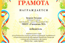 Поздравляем Звереву Татьяну, ученицу 11 класса нашей гимназии, победителя муниципального этапа республиканского конкурса детских публикаций, посвященных интернациональной дружбе народов Республики Татарстан в рамках республиканского фестиваля «Вместе мы – одна страна!» (руководитель: Валиуллина Г.Н.). Удачи на республиканском этапе!