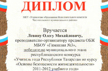 Левин Олег Михайлович, преподаватель – организатор предмета ОБЖ нашей гимназии занял первое место в муниципальном этапе республиканского конкурса «Учитель года Республики Татарстан по курсу «Основы безопасности жизнедеятельности» 2011-2012 учебного года». Поздравляем! Желаем победы на зональном этапе!
