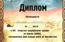 В Набережных Челнах прошел XIV открытый традиционный турнир по борьбе самбо, посвященный Дню вывода войск из Афганистана. Усанова Алена, ученица 2В класса нашей гимназии заняла 1 место. Молодец!
