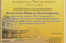 15 февраля 2012 года начальник отдела МВД России по Чистопольскому району подполковник полиции Соколов А. В. вручил в торжественной обстановке благодарственное письмо социальному педагогу МБОУ «Гимназия №3» Беспаловой Н. В. за активное сотрудничество с правоохранительными органами по профилактике и раскрытию преступлений среди несовершеннолетних. При содействии социального педагога МБОУ «Гимназия №3» Н. В. Беспаловой были раскрыты два преступления по ст. 163 ч.2 УК РФ и ст. 156 УК РФ.