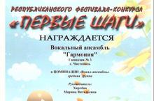 Подведены итоги Республиканского фестиваля – конкурса «Первые шаги», организованного МО и Н РТ. Вокальный ансамбль МБОУ «Гимназия №3» «Гармония» награжден дипломом III степени в номинации «Вокал – ансамбль» средняя группа. (руководитель: Харчева М.В.) Молодцы!