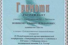 Министерство образования и науки Республики Татарстан благодарит Чикрину Веру Александровну, учителя русского языка и литературы нашей гимназии за подготовку победителя и призера IX Республиканской научно-практической конференции «Литературоведение и эстетика в XXI веке» («Татьянин день»), посвященной памяти Т.А. Геллер. Поздравляем!