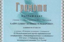 Поздравляем Хайруллину Ксению, ученицу 11 класса нашей гимназии, занявшую II место в IX Республиканской научно-практической конференции «Литературоведение и эстетика в XXI веке» («Татьянин день»), посвященной памяти Т.А. Геллер (секция «История культуры»). Дальнейших успехов!