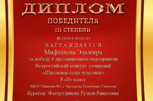 Центр развития мышления и интеллекта награждает Дипломом победителя III степени Мифтахову Эльмиру, ученицу 8 «В» класса (куратор: Фатхутдинова Р.Р.) за победу в дистанционном мероприятии Всероссийского конкурса сочинений «Школьные годы чудесные». МОЛОДЕЦ! УДАЧИ!