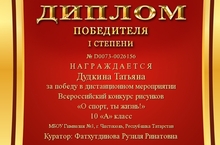 Центр развития мышления и интеллекта награждает Дипломом победителя I степени Дудкину Татьяну, ученицу 10 «А» класса (куратор: Фатхутдинова Р.Р.) за победу в дистанционном мероприятии Всероссийского конкурса рисунков «О спорт, ты жизнь!» МОЛОДЕЦ! Дальнейших побед!