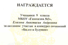 Благодарственным письмом ГКУ «Центр занятости населения г. Чистополя» за активное участие в конкурсе сочинений «Билет в будущее» награждена Елагина Анастасия, учащаяся 9 Г класса. Дальнейших успехов!